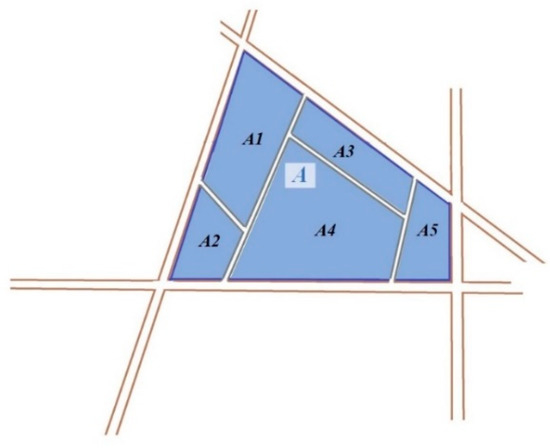 However, there are two problems that should be solved in this process. Firstly, the road network in the city can be divided into several levels (e.g., main road, trunk road, secondary trunk road and branch road). Hence, the selection of the level of the road network is the first problem. In general, lower level road networks represent smaller road networks spacing. The lowest level road (i.e., branch road) network will fragment a meaningful place. The blue area in Figure 3 is Square A: the branch road network contains many small paths, which can divide Square A into many fragmented patches (A1, A2, A3, A4, A5). Further, in similarity analysis, trajectories are normally considered to be similar because they pass by a few identical locations/places. Consequently, the lower-level road network should be selected based on the fact that meaningful places are not fragmented. In this way, the sampling points at the same place can be prevented from being divided into different areas, thereby improving the accuracy of the calculation results.