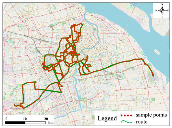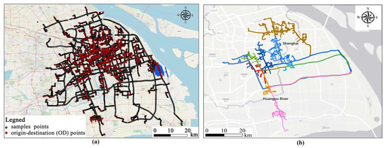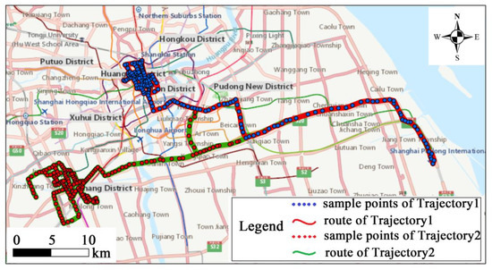 The taxi trajectory data used in this paper were provided by a commercial company in Shanghai. They are temporally ordered position records collected from about 6000 Global Positioning System (GPS) enabled taxis. The data was collected over a period of 7 days from 4 June to 10 June 2018. The average sampling interval of the data was 10 s. In the database, the trajectory data of each vehicle is a series of position records arranged in chronological order. Each record has many attributes, i.e., Taxi identifier Time, Speed, Direction, Current location (longitude, latitude) and Passenger state. The “Taxi identifier” is a unique identifier of a taxi, while “Time” contains an accurate date and time for each record. “Speed” represents the speed of a taxi at a given time. “Direction” is the horizontal angle measured clockwise from the north direction. “Passenger state” is a Boolean variable that denotes whether the taxi is carrying passengers or not. In space, the raw GPS trajectory data is represented by a series of discrete points. Figure 8 illustrates the sample points of one taxi with the identification number of 10,383 on the 4 June 2018. The sample points are red, while the trajectory route is green. The trajectory route is generated by sample points in chronological order.