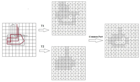 In Figure 6, the similarity calculation of the taxi trajectories T1 and T2 is visualized. After the trajectory conversion and the unique value processing, trajectory matrices are obtained and displayed in the grid, where 1 indicates that the trajectory passed the grid and 0 indicates that it did not pass. After calculation, T1 passes through 27 grid cells, T2 passes through 24 grid cells. The intersection of trajectory matrices (see the common part) is 18, and the union is 27 + 24 − 18 = 33. So, the result of the similarity is 18/33 = 0.55.