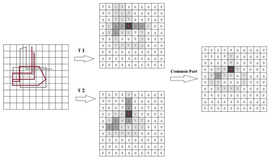 Using this algorithm, the process of calculating the structural similarity of trajectories T1 and T2 is shown in Figure 7. The attribute value represents the number of times the trajectory passes through the grid cell. For T1 and T2, the sum of the grid attributes of the common part is 21, and the sum of these two trajectory matrices are 34 and 32, respectively. So, the result of the similarity is 21/(34 + 32 − 21) = 0.47.