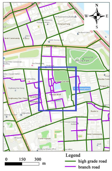 The roads in Shanghai can be divided into five levels. These are expressways, main roads, trunk roads, secondary trunk roads and branch roads. In this study, the method of visual interpretation was adopted to select the suitable road network. For example, in the blue frame (Figure 9), the branch road network contains too many small paths, which can divide the “Town God’s Temple” area into many fragmented patches. Consequently, the second trunk and above road (i.e., expect branch roads) should be selected as input data.