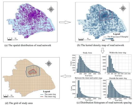 The spatial distribution of the road network in Shanghai is unbalanced (as shown in Figure 10a,b). The density distribution of the road network coincides with the ring road (Figure 10b), which are the two ring expressways. The road network density in the inner ring area is the highest, successively, in the area between the inner and outer rings and in the outer ring area. Therefore, the study area was divided into three sub regions. These are the inner ring area, the area between the inner and outer rings, and the outer ring area. The road network spacing per unit area of the three regions was calculated, respectively. As shown in the histogram (Figure 10c), the average distance of the road spacing in different zones varied a lot. The average distance in the inner ring area is 350 m (mainly ranging from 200 to 450 m), followed by the 700 m in the area between the inner and outer rings (mainly ranging from 400 to 1000 m) and 1500 m in the outer ring area (mainly ranging from 800 to 2000 m). Consequently, the grid size of the three sub areas is 350, 700 and 1500, respectively (Figure 10d).