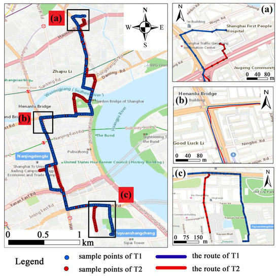 As shown in Figure 11a, these sampling points of the two trajectories belong to the same area, Shanghai General Hospital. However, due to the different locations of the pick-up points, the geographic coordinates and shapes of the two trajectories in this area are different. The area in Figure 11c is a very famous scenic spot named Yu Garden, where the density of vehicles and population is high. Vehicles are likely to choose other routes to reach this area due to the road congestion. In our approach, we focus on the place where the trajectory passes rather than the geographic coordinates. Therefore, the trajectories to reach this area are considered similar. Additionally, due to the unstable GPS signal, the geographic coordinates of the sampling points will have an error of 10−20 m. The shape and distance between sequences of the same route may be different (Figure 11b), which may cause the calculation results to be inaccurate.