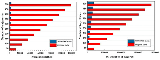 We selected 10 sets of data for the experiment, and the number of trajectories was 50, 100, …, 500, respectively. For the data storage, not only the sizes of data space but also the number of trajectory records were compared between the original trajectory and the converted trajectory. As shown in the Figure 13, the data space for original and converted data changed linearly with the increased number of trajectories. The comparison shows a significant difference between the original trajectory and the converted trajectory. The original trajectory occupies 34-times more storage space than the converted. By transforming and converting the trajectory data, the record of the data is only 1/10 of the original data.