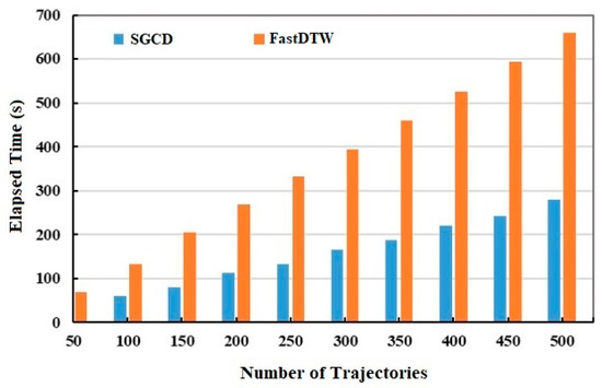 Subsequently, the performance of the similarity search technique between our algorithm and FastDTW algorithm is measured by comparing the average elapsed time. As shown in Figure 14, the experimental results confirm that the elapsed time of the two models increases linearly as the number of trajectories increase. However, the time consumption for the FastDTW algorithm is higher than our method (about 2.4 times). There are two main reasons. First, although our model needs a part of time for trajectory conversion, trajectory conversion can greatly reduce the amount of data to reduce the elapsed time. Second, our model does not need to calculate the distance between each pair of sampling points. Therefore, our proposed similarity algorithm (SGCD) has great advantage in processing large-scale trajectory data.