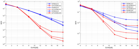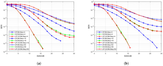 The simulation results are shown in Figure 2a,b. The red curves represent the performance of UP-OCDM, while the blue curves and green curves represent the performance of OCDM and OFDM, respectively. We observe that UP-OCDM and OCDM with MMSE equalizer have similar performance under doubly selective channels. In the meantime, both of them outperform OFDM due to the contributions of diversity gain via using chirped subcarriers. However, it should be noted that, with the modulation level increasing from 4 to 64, the performance of UP-OCDM and OCDM will suffer severer degradation than OFDM. For instance, for the 4-QAM case, the curves of UP-OCDM and OCDM systems intersect the curve of OFDM at about SNR = 5 dB, which means UP-OCDM and OCDM will outperform OFDM when SNR is more than 5 dB, whereas, for the 16-QAM, the intersection is at SNR = 10 dB. This is because high-level modulation formats in UP-OCDM and OCDM are more sensitive to noise. Nonetheless, the BER performance still gets better than OFDM for SNR > 22 dB in the worst scenario, that is, 64-QAM mapping and the normalized Doppler 0.3.