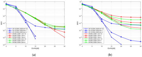 The simulation results are given in Figure 4a,b. The blue curve is the BER of UP-OCDM system. The green curve and red curve are the BER of OFDM with the equalizers proposed in References [25,27], respectively. We observe that outstanding performance can be achieved by the iterative LSQR equalizer for UP-OCDM under high Doppler scenarios than the equalizers for OFDM. Moreover, compared with the LSQR based equalization algorithms for OFDM, the complexity of the proposed equalization algorithm is reduced by because of the circulant structure of transform matrix , which means that the symbols vector can be directly recovered by applying the LSQR algorithm without an extra step of recovering the symbol vector from an intermediate variable which is estimated by LSQR first. Moreover, generally, the performance of the proposed algorithm gets better with the increase of iteration numbers, because the inversion error will be smaller with more iterations. However, it should be noticed that, in low SNR regions, a larger iteration number does not always lead to a better BER performance. This is because the proposed LSQR based does not require any statistics information. When the SNR is low, a larger iteration number might cause severer noise amplification and lead to worse BER performance. Nonetheless, the performance of the proposed is better than the similar LSQR based equalizers in OFDM with less computational complexity by . Moreover, compared with the MMSE block equalizer proposed in Section 3.3, the complexity is reduced to from , while maintaining comparable performance.