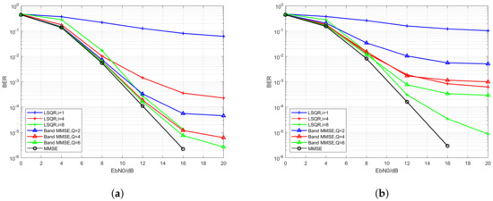 The simulation results are shown in Figure 5a,b. The blue curves denote the pair with the lowest complexities, or the pair. The red curves denote the pair with larger complexities, that is, the pair. Moreover, the green curves represent the pair with and , which leads to the largest computational complexities among the three pairs. Besides, the MMSE block equalizers, whose complexities are , are plotted with black curves. From Figure 5a, it can be seen that when the Doppler spread is relatively low, the performance of the band MMSE equalizer can outperform the iterative equalizer with similar computational complexity. Whereas, when it comes to the fast-moving scenario, as shown in Figure 5b, the performance of the band MMSE equalizer will suffer huge degradation, and the performance of the band MMSE equalizers becomes worse than the iterative LSQR equalizers in the second and the third pairs (e.g., the red and the green curves). Moreover, it can be seen from the curves with different colors (e.g., different computational complexity) in both Figure 5a,b that, the performance of the LSQR iterative equalizer can obtain a huge improvement with the increase of computational complexity and might be comparable to the MMSE block equalizer. In other words, the improvement brought by extra computational complexity for the band MMSE equalizer is not so significant as the iterative LSQR equalizers. Moreover, it should be noted that the complexity of the iterative LSQR equalizer is still much lower than the MMSE block equalizer when a relatively large i (e.g., in this section) is used. Finally, we can conclude that, when the Doppler spread is small, or the capacity of computational complexity in the system is severely limited, it might be wise to choose the band MMSE equalizer. On the other hand, when the Doppler spread is large, or the system can bear a relatively higher computational cost, the iterative LSQR equalizer is preferred then.