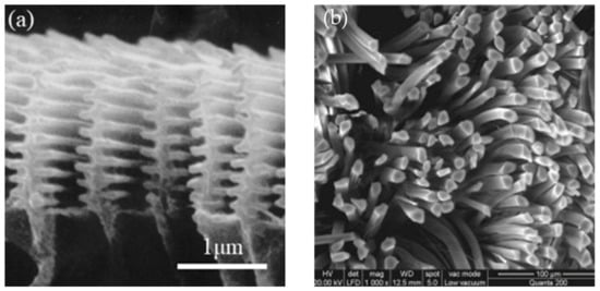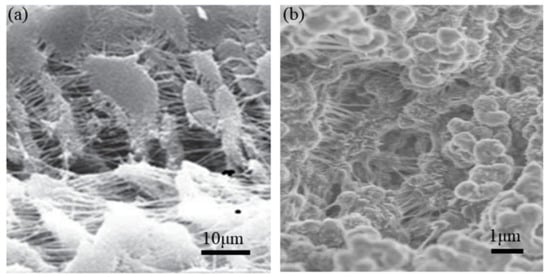 Processed microporous polymeric structures of polytetrafluroethylene (PTFE) (Figure 14a) with disc-like structures and fibrils are highly anisotropic with negative Poisson’s ratio []. This auxeticity under an applied load is due to a cooperating network of interconnecting nodules and fibrils. A similar nodule-fibril structure can be achieved in ultra-high molecular weight polyethylene (UHMWPE) (Figure 14b) by the processes of compaction, sintering, and extrusion []. Expansion of the nodules in the transverse direction and the fibrils being pushed apart at the same time result in large negative Poisson’s ratio values.
