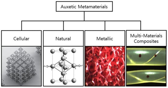 The term “auxetics”, derived from the Greek word “auxetikos” meaning “what tends to increase” was introduced by Evans in 1991 []. Auxetic structures or materials typically have a negative Poisson’s ratio. Materials with near-zero homogeneous Poisson’s ratios are known as “anepirretic materials” []. Other desirable material properties, such as superior shear resistance [], indentation resistance [], fracture resistance [], synclastic behavior [], and variable permeability [], are also seen in auxetic materials. Figure 3 shows that based on their base material and internal structure, auxetic metamaterials can be broadly classified as cellular, natural, metallic, or multi-material composites [].