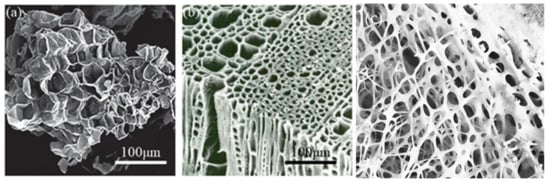 Scheffler and Colombo maintain that “Cellular materials are formed by periodic or stochastic arrangements of open or closed cell types, with either two-dimensional cell configurations (such as honeycomb) or three-dimensional polyhedral layouts (such as lattice structures)” []. Cellular materials offer unique functional characteristics, such as high specific strength and stiffness, enhanced absorption of mechanical energy, and heat-transfer control, allowing design freedom beyond the capabilities of solid materials []. To achieve the desired application requirements, the properties of the cellular materials can be tuned by manipulation of cell topology and size []. Figure 4 shows examples of cellular microstructure in nature.