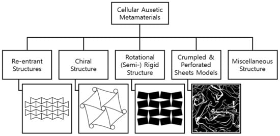 Figure 5 shows that cellular auxetic meta-materials can be categorized into re-entrant structures, chiral structures, rotational (semi-) rigid structures, crumpled and perforated sheet models, and other miscellaneous structures.