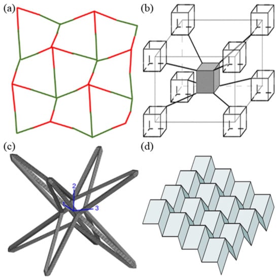 Examples of miscellaneous structure; (a) the egg rack model, (b) tethered nodule model, (c) hexatruss model, and (d) origami structure [,,,].