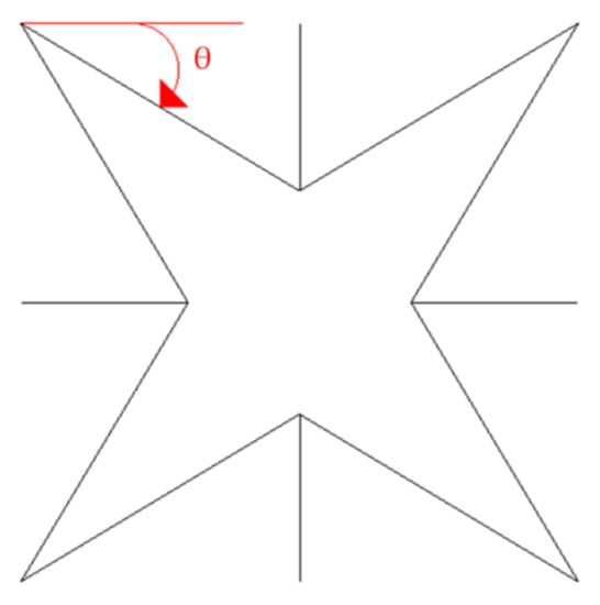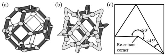 Figure 7 shows both a conventional cell and an ideal auxetic cell. The re-entrant angle in an irregular polygon is an interior angle that is greater than 180°, as seen in the ribs of the “bow-tie” honeycomb []. Figure 7c shows the re-entrant corner and re-entrant angle in an irregular polygon. Re-entrant structures are formed by hexagonal face cells, which have the edges protruding outwardly. Along with re-alignment (hinging), deflection and axial deformation (stretching) of cell ribs are also responsible for the deformation of re-entrant structures and auxetic behavior [,].