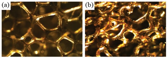 Lakes proposed his foam transformation procedure that involved controlled heating and tri-axial compression to convert conventional, open-cell thermoplastic foams to foams that exhibit re-entrant structures in 1987, and began the development of intentionally designed auxetic materials []. After being tri-axially compressed in a mold, the foam was heated to a temperature above its softening temperature, and then cooled to room temperature, after which it could be extracted to undergo relaxation. Strict adherence to this procedure transforms conventional unit cells to re-entrant cells []. Figure 8a,b show conventional and auxetic foams, respectively. The type of foam obtained depends on the application conditions of tri-axial compression. Tri-axial compression during the forming process enables the transformation of thermosetting foams, whereas sequential tri-axial plastic compression is used to obtain re-entrant metallic foams [,,]. Chan and Evans [], Quadrini et al. [], and Friis et al. [] also proposed a number of transformation processes in terms of advantages (such as intact cell structure), and disadvantages (such as increased anisotropy).