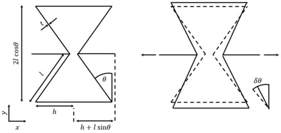 Grima et al. in 2006 [] first provided a description of the mechanical properties of the rotating rigid triangles system. A hinged equilateral triangle system showed a Poisson’s ratio of −1, while isosceles triangle tessellates, depending on the shape of the triangles and the angle between them, exhibited both positive and negative Poisson’s ratios [,].