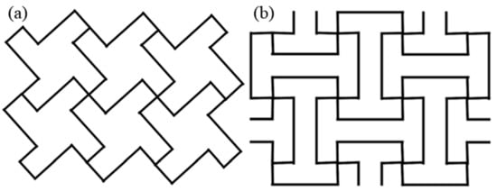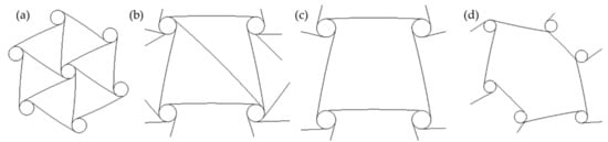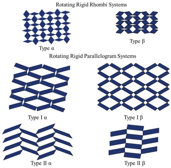 A rotating (semi-) rigid system is another category of auxetic microstructures. The rigid squares connected by simple hinges can be viewed as an idealized rotating structure. When loaded, the squares will rotate at the vertices, either expanding or contracting depending on the loading type []. It is further categorized into rotating squares, rectangles, triangles, rhombi, and parallelograms.