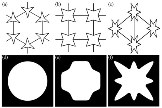 Re-entrant honeycomb structure: (a) 3-star, (b) 4-star, and (c) 6-star system []. Void shapes in 2D soft materials (d) exhibiting the highest stiffness, (e) exhibiting the greatest auxetic response, and (f) showing the least compaction with positive Poisson’s ratio [,].