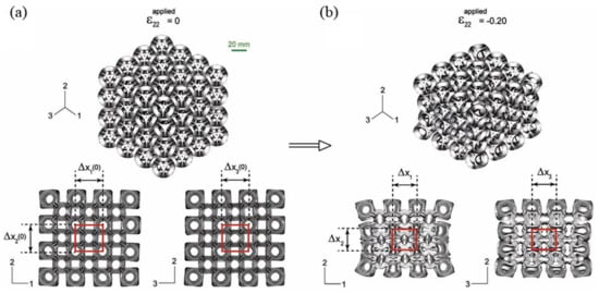 The first artificially built 3D auxetic system exhibiting a ν = −1, dates back to at least the structure proposed by Almgren []. Ever since, modifications in microstructure parameters such as strut length and re-entrant angle have produced a number of geometries exhibiting auxetic behavior. Koerner et al. [] proposed an eigenmode analysis of a basic unit cell-based approach to systematically identify a variety of complex 2D and 3D auxetic structures. The auxetic behavior was ascribed to the rotation of nodal points or strut midpoints. They concluded that if these rotational points represented lattice symmetry, complete auxetic behavior would be obtained. Yang et al. [] and Buckmann et al. [] built several 3D re-entrant structures using additive manufacturing techniques. These works were important from the point of view of comparing the compressive strength, and it was shown that the compressive strength of highly auxetic structures could potentially be much higher than that of the regular, conventional foams []. An increase in the re-entrant angle increases the auxeticity of a unit-cell structure with re-entrant hollow skeletons []. The 3D extension of the buckling-induced pattern transformation in 2D, also known as “Bucklicrystals” in Figure 12, refers to the periodic arrangement of patterned spherical shells, which undergo isotropic volume reduction in response to a force stimulus, when all ligaments undergo a uniform first buckling mode [,]. Further investigations carried out by Shen et al. [] and Lim et al. [] proposed the elastomeric NPR structures based on simple initial geometries and the 3D anisotropic intersecting double arrowhead structure respectively. However, Yang et al. reported that for the models they studied, auxetic behavior not only depended on the re-entrant cell shapes, but also depended on the angle.