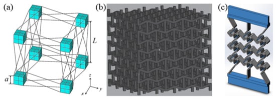 Three-dimensional chiral structures made of cubes and deformable ribs with regulatable Poisson’s ratio (−0.14) were extensively analyzed by Ha et al. [] using finite element approaches. The lattices exhibited a stretch–twist coupling that increased with relative slenderness of ribs [], and the Young’s modulus and effective shear modulus were found to be dependent on the number of unit cells per side. Jiang et al. [] were able to integrate chiral and re-entrant structures by designing hybrid metamaterials, which were analyzed using mechanical experiments on 3D printed models and finite element simulations. These hybrid metamaterials had the re-entrant core cells in the center of a basic chiral cell.