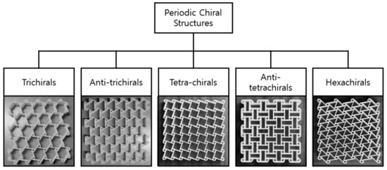 Even though symmetry is a scientific law of nature, asymmetry is also a main melody in our universe. From the basic components of living things, such as DNA and proteins, to the celestial bodies such as galaxies, asymmetry can be found everywhere. A chiral unit is comprised of a central cylinder encapsulated in tangentially attached ligaments, which is not superimposable on its mirror image, whereas anti-chiral structures exhibit reflexive symmetry []. Basically, a chiral structure is inseparable into two identical halves. Natural chiral materials include those found in flower petals and stems that climb in twisted fashion, including tendrils and twisted leaves. Chiral structures are classified into 2D chiral lattices, tri-, tetra-, and hexachiral honeycombs, meta-chiral structures, and 3D chiral lattices. Figure 15 and Figure 16a show examples of 2D and 3D chiral structures, respectively.