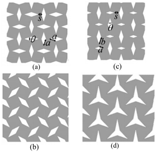 Perforated sheet systems. (a,b) Diamond-shape inclusions of the same size but at different orientations; (c) diamond-shaped inclusions of different sizes, and (d) star-shaped inclusions [,].