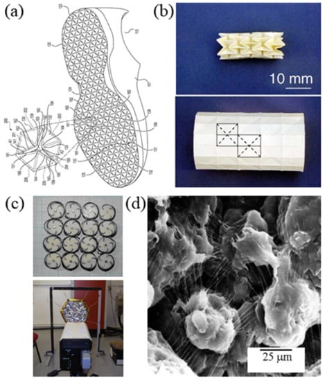 Crumpled sheet models are influenced by traditional paper-art techniques, such as ‘Kirigami’ and ‘Origami’, and have inspired several researchers to engage in studies of auxetic materials. Both Kirigami and Origami are Japanese paper arts, but unlike Origami, which only folds one piece of paper, Kirigami can cut paper as well. While the cellular fiber network structure in the sheet is responsible for the auxetic behavior of paper structures, the effect of materials and processing techniques on the auxetic behavior needs further research. Today, computer programs like Tree Maker [] can be used to design various folding patterns of arbitrary complex three-dimensional structures, including Origami (Kirigami) auxetic structures [,]. The non-linear mechanical properties of Origami metamaterials are very interesting. A bi-stable behavior of unit cells is observed where switching of even one cell leads to a defect in the lattice []. Additionally, since the origami metamaterials can be extremely light yet rigid, they can be used for space applications as seen in the usage of Miura folding in deploying satellite solar panels in space []. Figure 18 is a typical example and design of an origami structure.