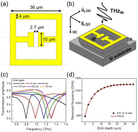 Our THz metamaterials were simulated using ANSYS High-Frequency Structure Simulator (HFSS) to calculate the frequency dependent simulated transmission and thereby resonant frequency. Figure 1a shows that the SRR consists of a rectangle with outer dimensions of 36 × 36 μm2, with a gap of 2.7 μm and a length of 10 μm introduced along one edge. The width and the thickness of the SRR were chosen to be 4 μm and 100 nm, respectively [19]. In order to obtain the transmission spectra (S21) of metamaterials, two-port S-parameter simulations were performed with a linearly polarized incident THz plane wave. Periodic boundary conditions with a periodicity of 50 µm around the unit cell were chosen, providing a similar areal density of the metamaterial elements to previous studies [20]. The transmission spectra obtained through the simulations showed good agreement in both the resonant frequency and quality factor to resonances found experimentally in our previous work [19]. A refractive index of 3.44 was used for Si substrate, as obtained using conventional THz time-domain spectroscopy methods in our prior work [19]. We note that an experimental error of ±0.02 for the Si substrate refractive index, which can induce knock-on changes of ~0.5% in the calculated resonant frequency of the metamaterials, was neglected here for simplicity. Figure 1b shows a schematic diagram of the metamaterial devices with etched substrate along with the polarization direction of the incident THz waves in the transverse-magnetic polarization geometry studied. Substrate etching was simulated by progressively removing the top surface of the substrate to an etch depth d, which was applied to the whole surface except where the metamaterial geometry was located (the metal features then effectively forming an etch mask in practical implementations).