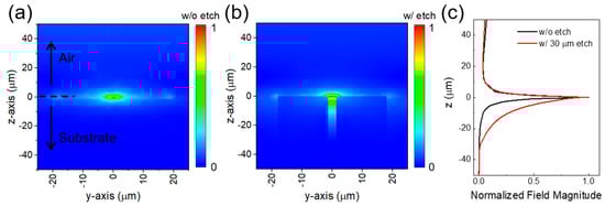 In order to understand the effect of the etching on the resonances further, the magnitude of the electric field near the metamaterial structures both with and without etching were investigated at the resonant frequency. Here, using the coordinate system shown in Figure 1a and with the centre of the metamaterial gap structure then located at x = 0, y = 0, and z = 0, the 2D electric field near the metamaterial structure along the y–z plane at x = 0 both without and with etching (etch depth of 30 µm) was calculated, as shown in Figure 2a,b respectively. We note that the electric field distribution shown in Figure 2b extends further towards the etched substrate surface. This is due to the decrease in the effective refractive index underneath the metamaterial geometry upon etching. The electric field magnitude along the z axis at x = 0 and y = 0 was extracted from Figure 2a,b and plotted in Figure 2c. The electric field magnitude at the resonant frequency has a maximum value at the centre of the gap structure and then decays exponentially towards both the substrate and the air [19,20]. The decay length of the electric field magnitude obtained by an exponential fit below the gap structure is increased approximately ~4-fold (from 2.2 to 8.7 µm) for an etch depth of 30 µm. These results indicate that etch depths larger than 30 µm will be not effective in reducing the effective refractive index for typical THz metamaterial geometries similar to those discussed here.