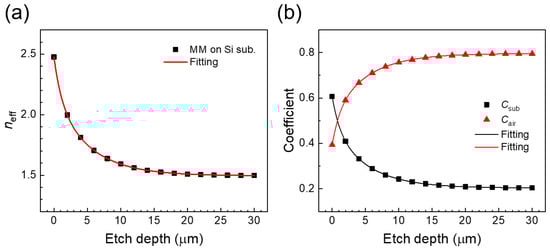 (a) neff as a function of substrate etch depth. (b) A plot of coefficient Csub and Cair as a function of substrate etch depth.