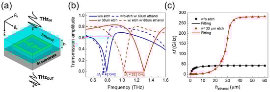 To study the effect of the substrate etch on the sensitivity for liquid sensing applications, we investigated the enhancement in sensitivity for varying thicknesses of a liquid layer deposited onto the etched metamaterial, as shown in Figure 4a. Ethanol was chosen as the analyte, since it is a crucial material in several industrial contexts, including its use in the beverage industry, where developing ethanol sensors is a requirement to the determine alcohol content of drinks [21]. Figure 4b shows the simulated THz transmission of the metamaterial both with and without a substrate etch depth of 30 µm, and both with and without the deposition of an ethanol liquid layer with a thickness of 60 μm. The ethanol layer was assumed to have a THz refractive index of 1.55 (= nethanol), as previously measured at 0.8 THz in previous work [22]. We used an etch depth of 30 μm, since the effective refractive index near the metamaterial is already saturated for this depth, as shown in Figure 3a. A liquid layer thickness (hethanol) of 60 μm was chosen to compare the fully saturated resonant frequency shift for both etched and unetched devices. The size of the resonant frequency shift obtained after deposition of an ethanol liquid layer with a thickness of 60 μm increased by a factor of ~6.7 upon etching, from 42 to 283 GHz.