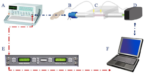 Schematic representation (not to scale) of the experimental setup used for the fiber optic particle plasmon resonance (FOPPR) sensing system. The system consists of: (A) function generator; (B) LED; (C) sensor chip; (D) photoreceiver; (E) lock-in amplifier; (F) computer.