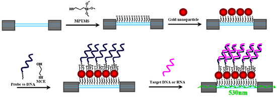 To detect the target ssDNA or ssRNA in a sample, a biosensing strategy based on conjugation of a ssDNA probe to the immobilized AuNPs on the fiber core surface was employed. Figure 2 shows a schematic of the strategy. A partially unclad optical fiber was functionalized with a thiol-terminated group by immersing in a toluene solution of 1% MPTMS. Then, the mercaptosilane-modified fiber was incubated in a solution of AuNPs to form a submonolayer of AuNPs on the fiber core surface. Next, the AuNP-modified fiber was first functionalized with a ssDNA probe, which was designed to bind specifically with its complementary target ssDNA or ssRNA. To minimize the non-specific binding and maximize hybridization efficiency between probe and target, a thiol-terminated alcohol, such as MCE and MCH [32,33,34], is often co-assembled with a thiolated ssDNA probe to form a mixed self-assembled monolayer (SAM) for erecting the ssDNA probe on AuNPs at a biocompatible interface with –OH groups to resist nonspecific adsorption. However, the treatment of thiol-terminated alcohols is tricky, too much thiolated alcohol will detach the HS-ssDNA probe from the AuNP surface, hence accurate control of reaction conditions is required [35].