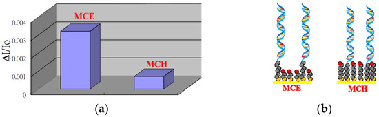 (a) Normalized absorbance changes before and after DNA hybridization for 27-mer ssDNA probe-conjugated AuNPs on glass slides based on 2-mercaptoethanol (MCE) or 6-mercaptohexanol (MCH) in the mixed SAM, (b) schematic illustration of mix SAMs with MCE and MCH as diluent.