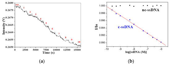 (a) A typical sensorgram using a 25-mer ssDNA probe for real-time detection of 25-mer target ssDNA upon sequential injection of standard solutions, where step 1 to step 10 represent concentrations 2.5 × 10−10, 5.0 × 10−10, 1 × 10−9, 5 × 10−9, 1 × 10−8, 5 × 10−8, 1.0 × 10−7, 2.5 × 10−7, 5.0 × 10−7, 1 × 10−6 M, respectively. (b) The plots of I/I0 versus target ssDNA concentration for both complementary ssDNA (c-ssDNA, blue square) and non-complementary ssDNA (nc-ssDNA, black diamond).