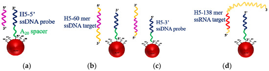 Schematic representation of the interaction between, (a) 30-mer H5-5′ ssDNA probe immobilized at 5′-end and 30-mer target ssDNA, (b) 30-mer H5-5′ ssDNA probe immobilized at 5′-end and 60-mer target ssDNA, (c) 30-mer H5-3′ ssDNA probe immobilized at 3′-end and 60-mer target ssDNA, and (d) 30-mer H5-3′ ssDNA probe immobilized at 3′-end and 138-mer target RNA.