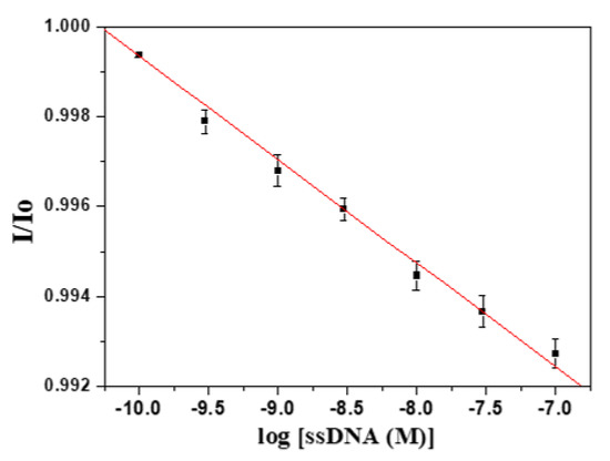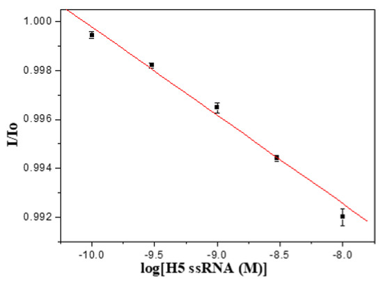 A calibration plot of H5-3′ ssDNA probe to detect 138-mer target ssRNA, ranging from 1.0 × 10−10 M to 1.0 × 10−8 M, (n = 3).