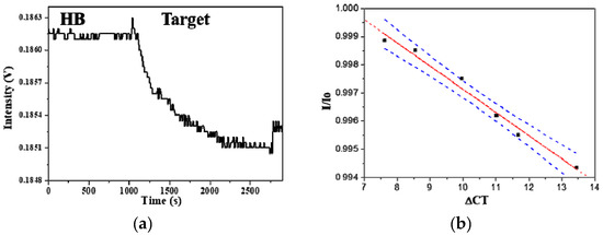 (a) Real-time FOPPR sensorgram with HLA-B27 ssDNA probe to detect mRNA in a sample which exhibits a ΔCT value of 13.64; (b) Graph displaying the correlation of results between the FOPPR biosensor and the real-time RT-PCR method for detection of HLA-B27 mRNA in blood samples. Blue dashed lines are the 95% confidence intervals for prediction with the linear regression model.