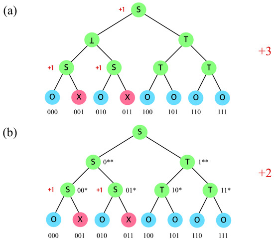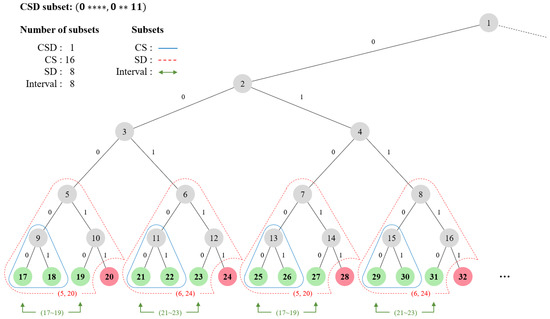 On the other hand, in the CSD algorithm, node is treated specially, different from the SD. Although the type of its children are both S, it is not necessary to exclude the node; if the node can be merged with a sibling node of type ⊤, it is possible to represent the node without generating a new subset. In Figure 5, the node has two subsets and , and it has a sibling node of type ⊤. When merging subsets and with , it generates and where and can include all eight users while 000 and 010 can exclude 000 and 010 since the CSD allows * in the middle of the representation regardless of the tree hierarchy. As a result, the CSD generates two subsets as and , which does not generates subsets more than the number of revoked users.