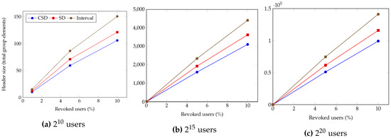 Figure 7 compares the header size of each broadcast encryption, by randomly revoking the users: by varying the total users to (a) , (b) , and (c) . The header size is measured by the number of group elements, where a single group element is a 20-bytes object from the pairing-based cryptography (PBC) library. In all cases, the CSD-based broadcast encryption outputs the smallest headers, compared to the SD-based and interval-based broadcast encryption.