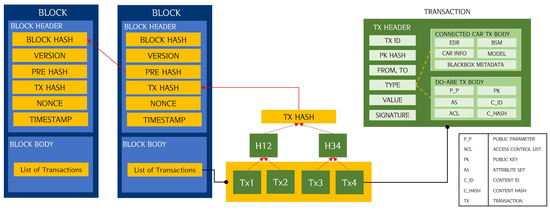 The transaction is divided into a transaction header and a transaction body. The header part of the transaction contains general items such as the transaction identifier (ID), amount to be sent, digital signature, recipient’s public key hash value, and type [25]. The transaction body contains vehicle-related data, black box video data, data for DO-ABE, or data trading related information. The type in the transaction header identifies the information contained in the transaction; thus, transactions are divided into connected-car transaction, DO-ABE transaction, and trading transaction.