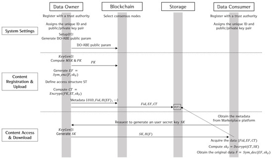 - System Settings: The proposed model adopts the consortium-type Blockchain in which a trusted authority exists. Therefore, all entities must be registered with the trusted authority before they participate in the system; and this process assigns a unique ID and a public/private key pair to each entity. In addition, the consensus nodes participating in the Blockchain are selected based on the adopted consensus mechanism. Each data owner generates DO-ABE public parameters to control their data and registers these parameters on the Blockchain through a DO-ABE transaction. For this purpose, the public parameter is generated through the function described in Section 2.3, and is then published on the Blockchain.