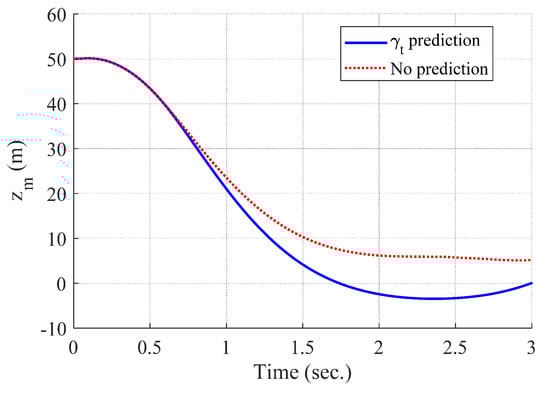 The performance using flight-path angle prediction is compared with the case of no prediction. In the no prediction case, MPC is computed with the current estimated flight-path angle, instead of Equation (23), as follows:
