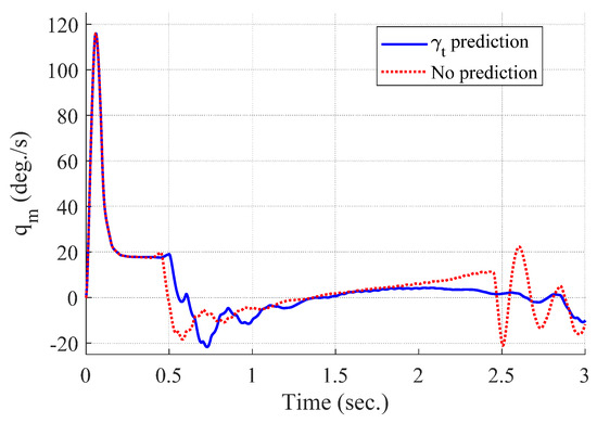 Figure 8, Figure 9, Figure 10 and Figure 11 show the time responses of the angle of attack, the flight-path angle, the pitch angle, and the pitch rate of the missile, respectively. Without flight-path angle prediction, the missile cannot handle the target’s pull-up maneuver as time goes on, and MPC gives the solution that oscillates at the end of terminal homing, as shown in Figure 5. This results in a poor miss distance as well as unnecessary acceleration effort as shown in Figure 4 and Figure 6. The oscillatory phenomenon can also be found in Figure 8, Figure 9, Figure 10 and Figure 11. Furthermore, divergence of the look angle at the end of terminal homing can be found with the no prediction case, as shown in Figure 7.
