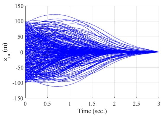 A Monte Carlo simulation is carried out to investigate the robustness of the proposed algorithm. A total of 300 different cases are generated where target missile properties and interceptor’s initial states are chosen at random using a normal distribution. The range of initial is set to , and the acceleration of the target varies with respect to time as follows:
