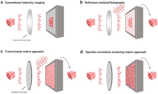 Recently, wavefront shaping or sensing techniques have shown potential for imaging through turbidity (Figure 1c). Because multiple light scattering in turbid media is a deterministic process, and phase information plays an important role in focusing and delivering optical information through complex media [43,63,64,65,66]. Still, the measurements of speckle fields require interferometry, and it results in difficulties in translation into practical applications. The concept of the SSM is to deliver optical field information through a turbid layer with a simple setup (Figure 1d), by exploiting the physical characteristics of light scattering and mathematical properties of auto-correlation. In this review, we present the principle of SSM and summarize recent SSM-based techniques.