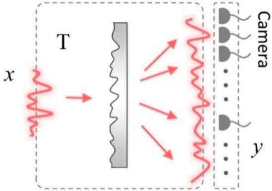 Let us consider a simple setup composed of an optical diffuser and a camera (Figure 2). Suppose there is an unknown input field , where is a basis that satisfies ; is the complex-valued coefficient of the i-th basis; and N is the number of input optical modes, . The basis can be arbitrary, but it is conventionally set to the position or reciprocal (Fourier) basis. The speckle field y at the camera plane can be expressed using the TM of the diffuser, , where corresponds to a speckle field for and the i-th column of TM. The speckle field is expressed using M complex values , where M is the number of optical modes observed at the camera.