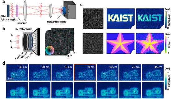 Lee and Park proposed reference-free holographic imaging based on the SSM [36], which is differentiated by the general principle and deterministic nature of the approach. In the experiment, an optical diffuser that transforms the incident field into a speckle field was placed in front of an image sensor to perform holographic imaging (Figure 3a). They calibrated the TM of the diffuser by projecting the image of a spatial light modulator and a reference beam, followed by a systematic change of the phase of the spatial light modulator (SLM) (Figure 3b). The calibration is based on phase-shifting interferometry, where three different phase shifts are applied to each input mode. Additionally, the speckle pattern of the reference beam is measured. Thus, the total 3N + 1 images were used for N input modes. The calibration time took 20 min for 3960 input modes. After calibration of the TM, the reference beam was blocked, and an object was imaged. Using the calibrated TM and the speckle image of an object, the Z matrix in Equation (2) is reconstructed. Then, by performing a singular value decomposition of the Z matrix, the complex coefficients for input modes are obtained (Equation (5)). The obtained complex coefficient corresponds to the holographic image of the object. In the experimental demonstration, holographic images of amplitude-modulated and phase-modulated incident fields were successfully measured (Figure 3c). The holographic image obtained by scattering from two dices was also measured, demonstrating three-dimensional imaging capability via numerical propagation (Figure 3d).