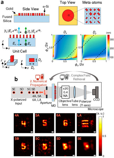 - Kwon, H.H.; Arbabi, E.; Kamali, S.M.; Faraji-Dana, M.; Faraon, A. Computational complex optical field imaging using a designed metasurface diffuser. Optica 2018, 5, 924–931. [Google Scholar] [CrossRef]