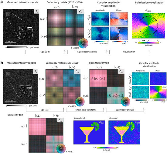 Coherency matrix and SSM. (a,b). SSMs measured from speckle patterns of polarized (a) and unpolarized light (b) become coherency matrices. A and ϕ are the amplitude and phase of light, respectively; Ix, is the measured intensity speckle in camera (x) domain; Zrs is the measured SSMs in the space–polarization (r and s, respectively) domain; H, V, L, and R are horizontal, vertical, left-circular, and right-circular polarizations, respectively; PL and PR are the statistical weight for the L and R polarizations, respectively; and and are the holographic images for the L and R polarizations, respectively. For both coherent and incoherent states of light, holographic images of two orthogonal polarizations are measured. Adapted with permission from [67], APS.